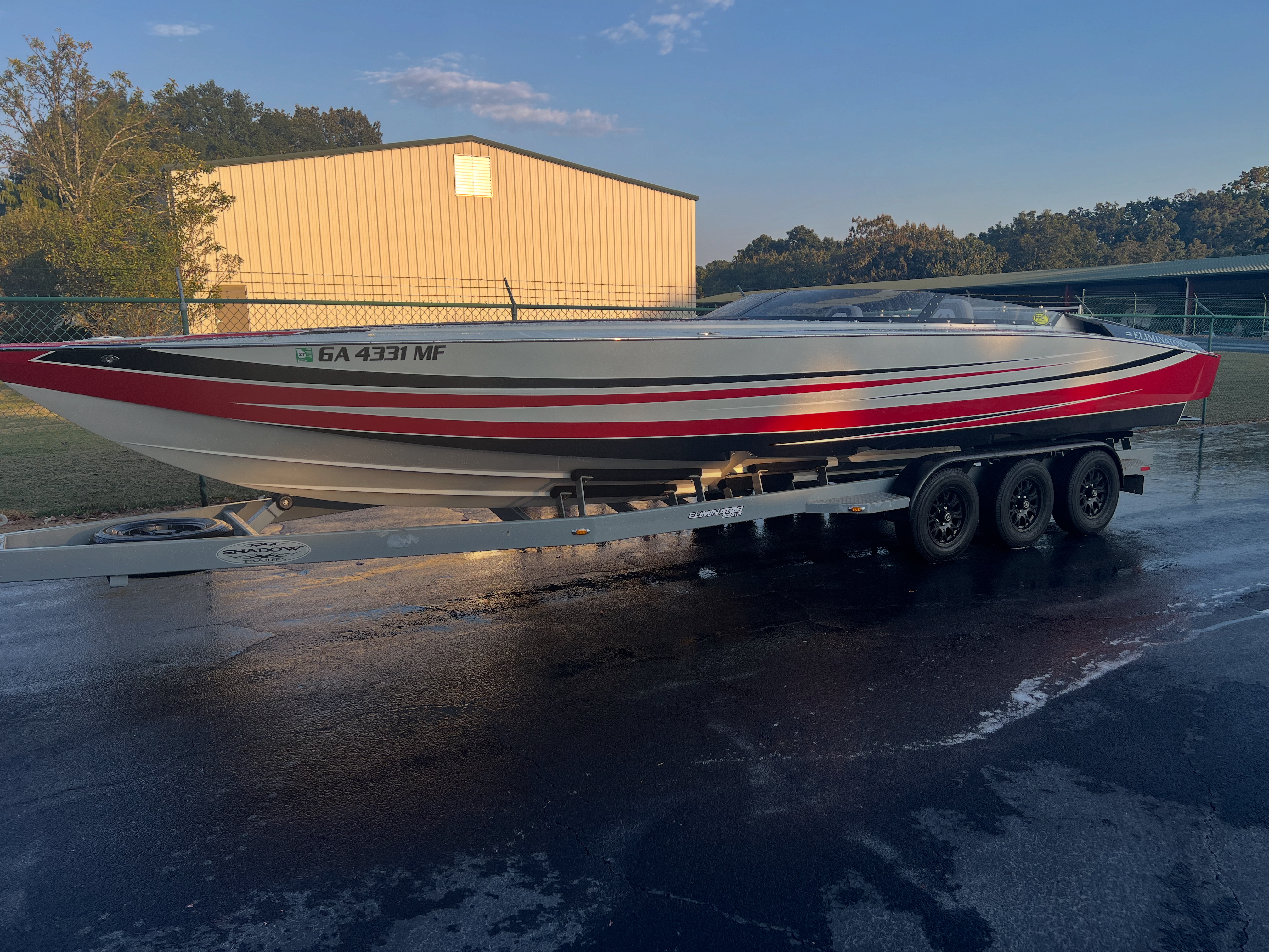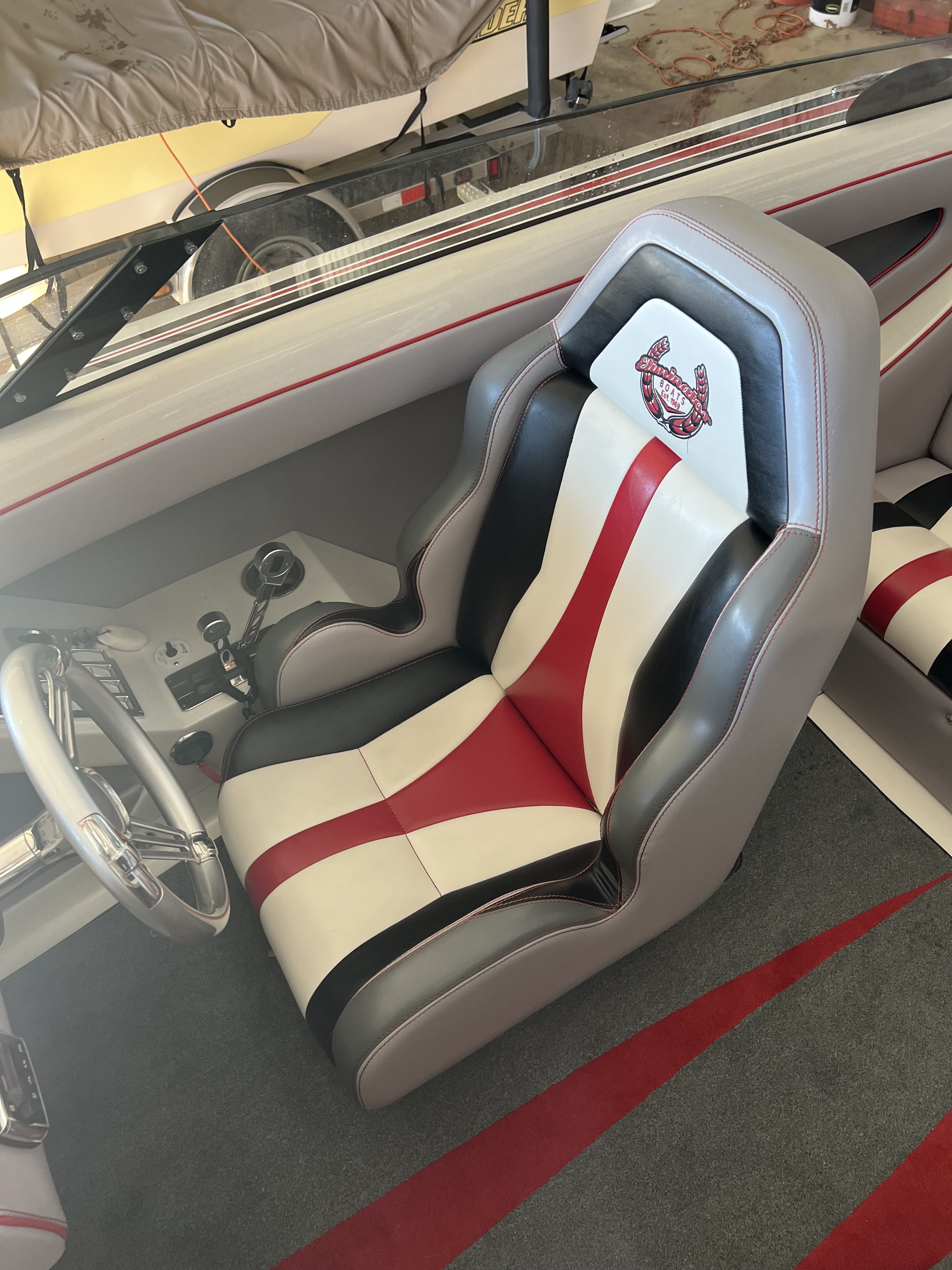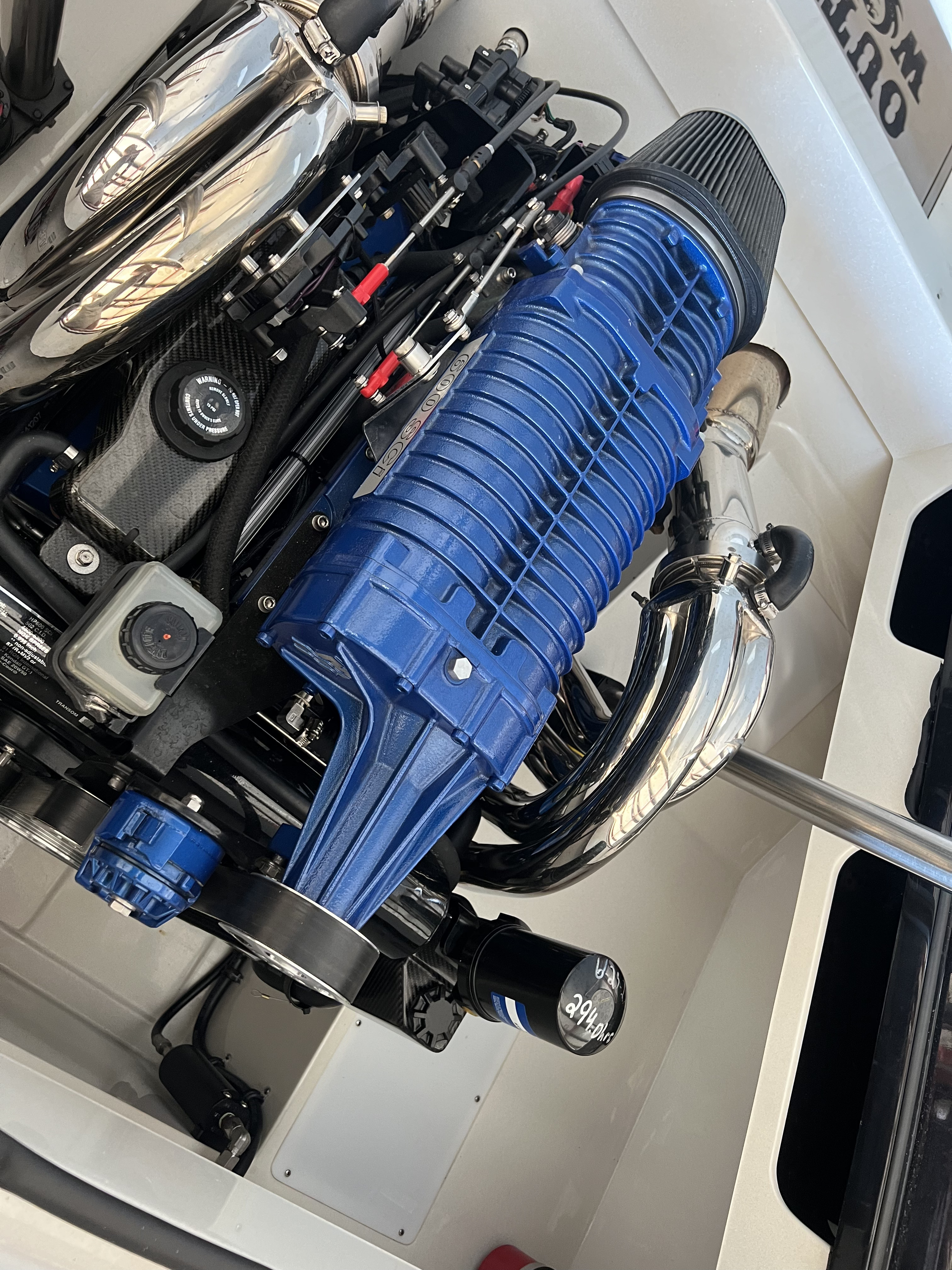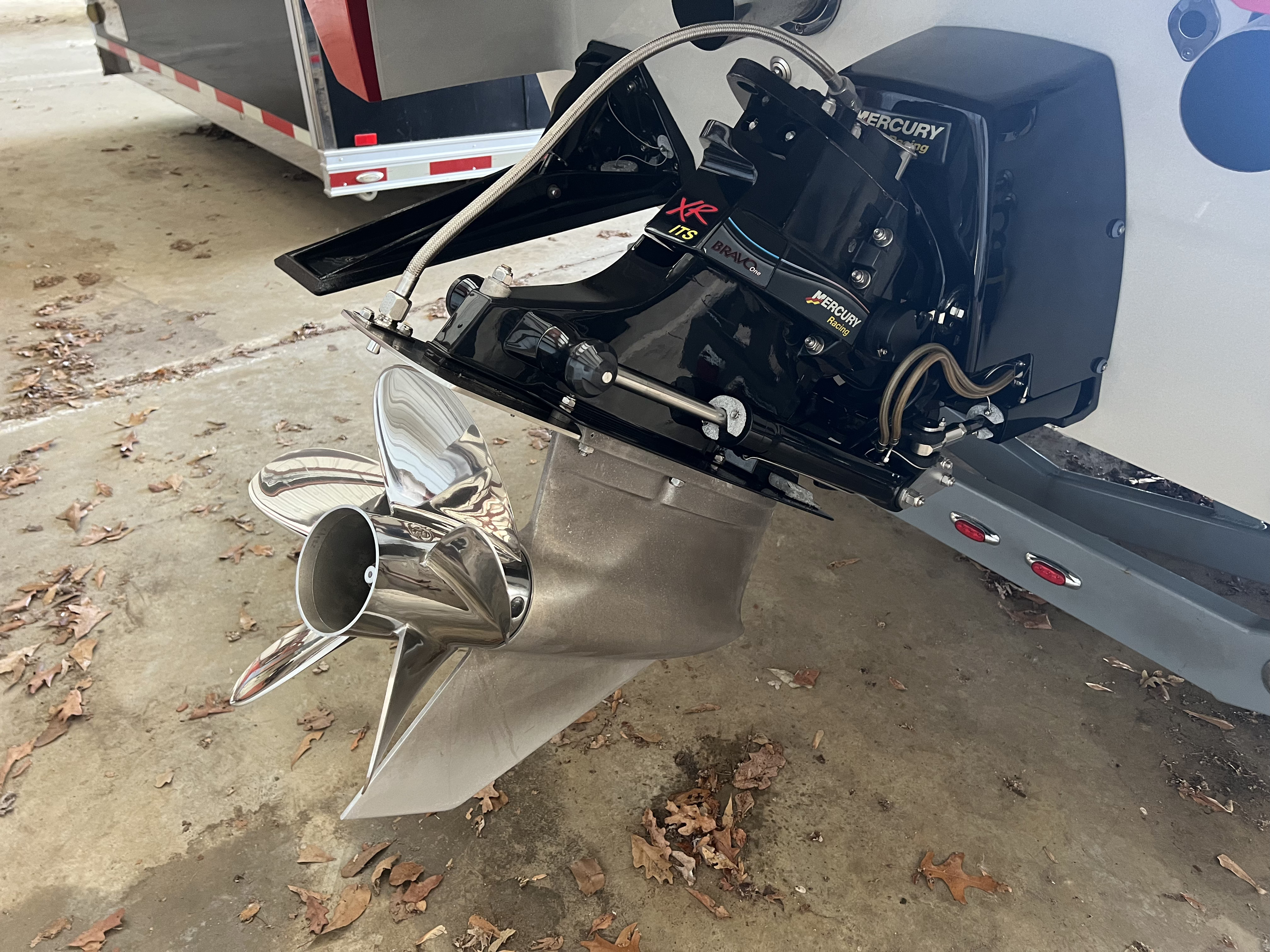 The boat is outfitted with a Mercury Racing 600SCI. When we purchased the boat it had a 4 blade prop and would run about 100 MPH. Since then we have installed a Mercury Racing Labbed 34p 5-blade prop, which slows it to 90+, loaded with fuel and crew, but it takes off and handles perfectly. Lavorsi gauges, 380 k plane tabs, upgraded 10” vessel view with charts. Cockpit cover, full cover, XR ITS Sportsmaster, fusion/kicker stereo, 300 hours on factory sealed engine.