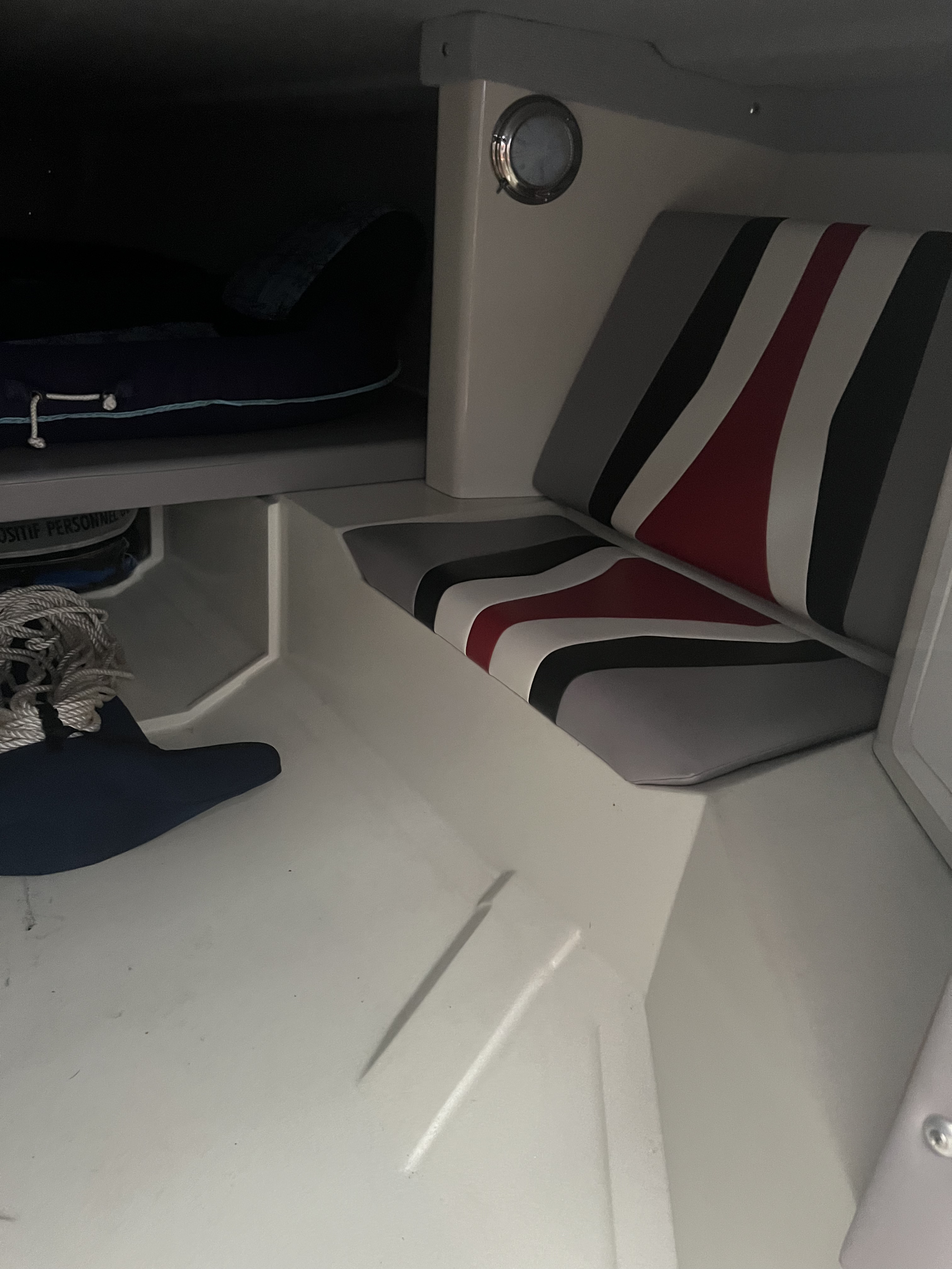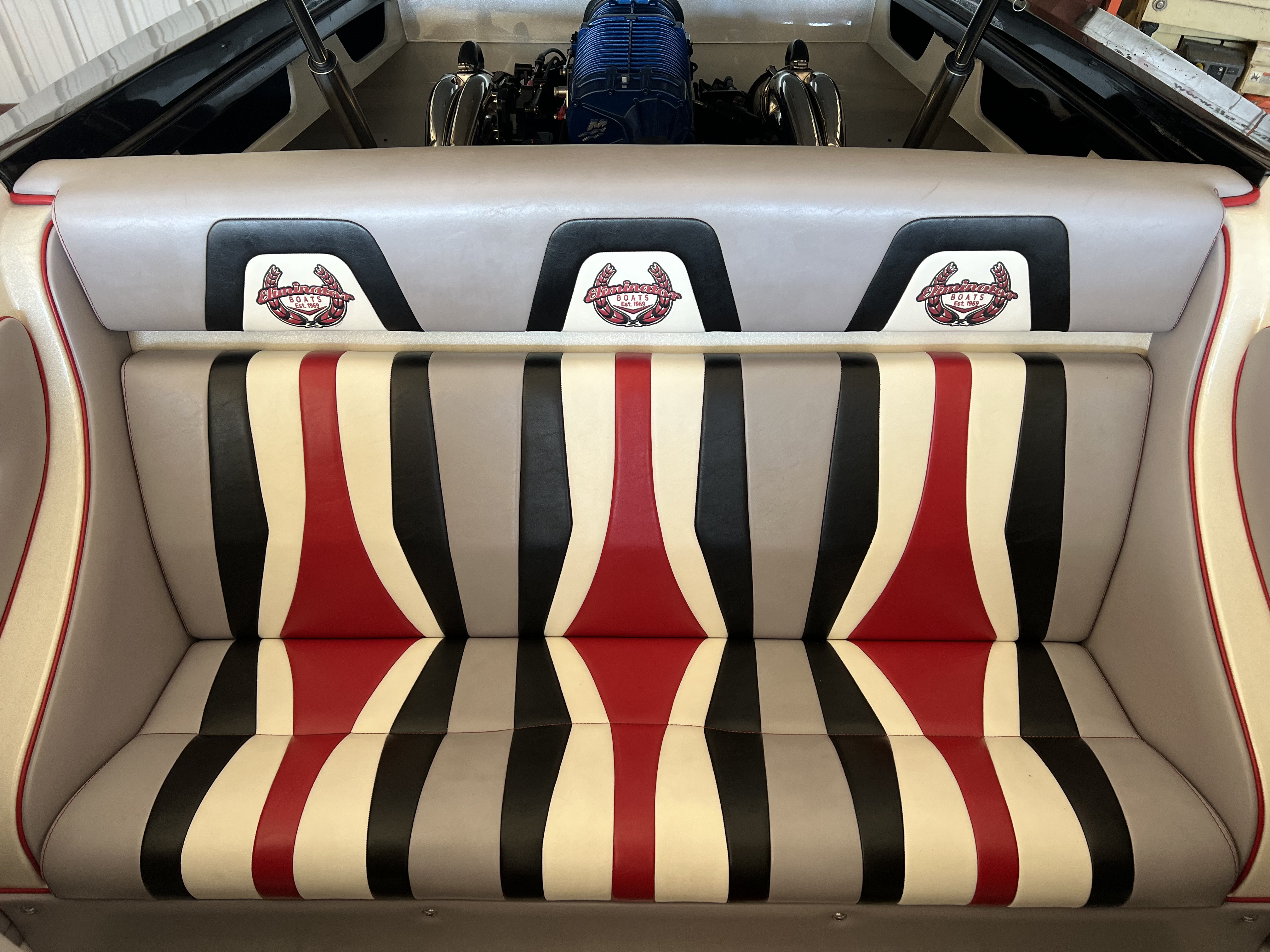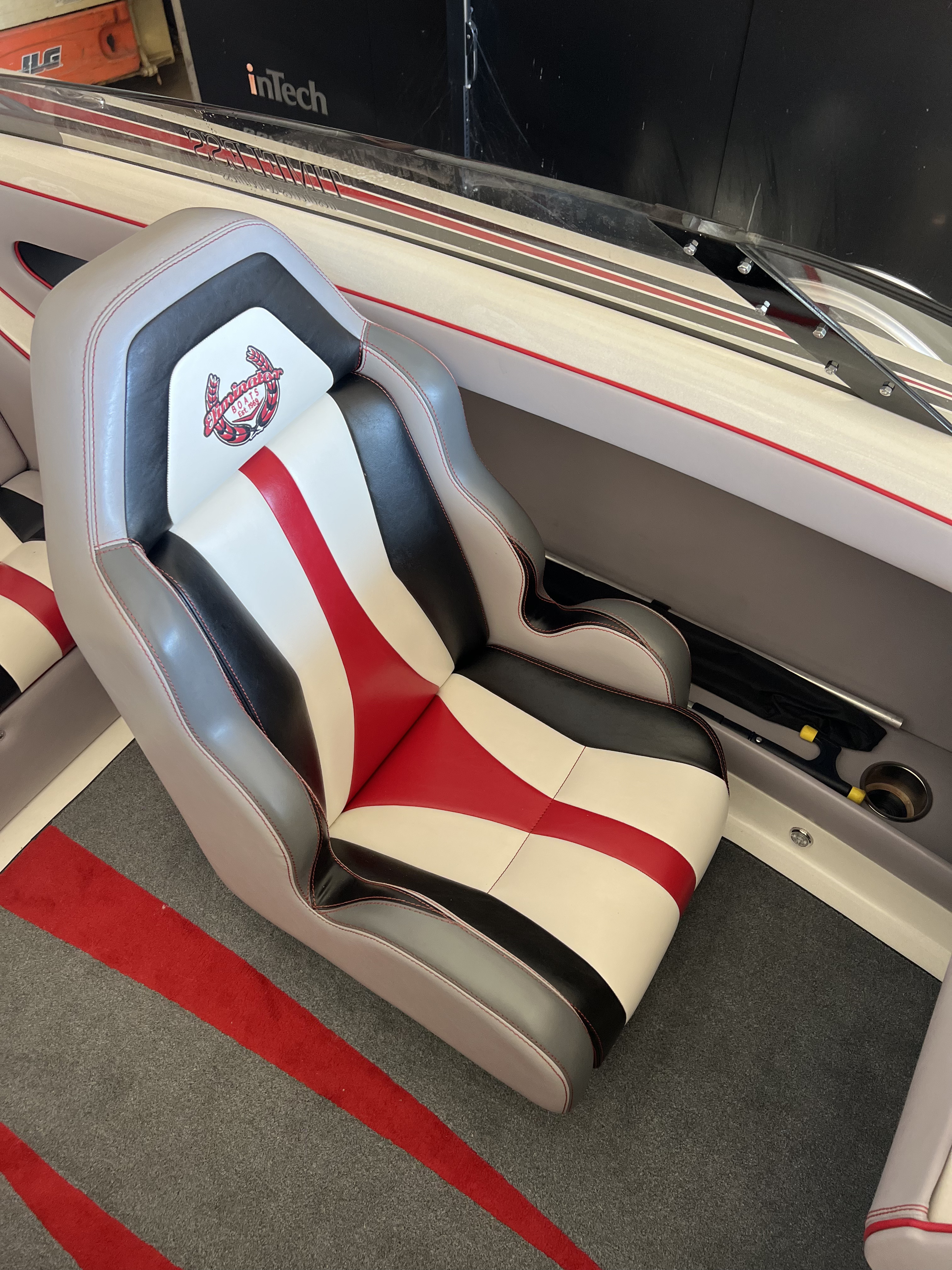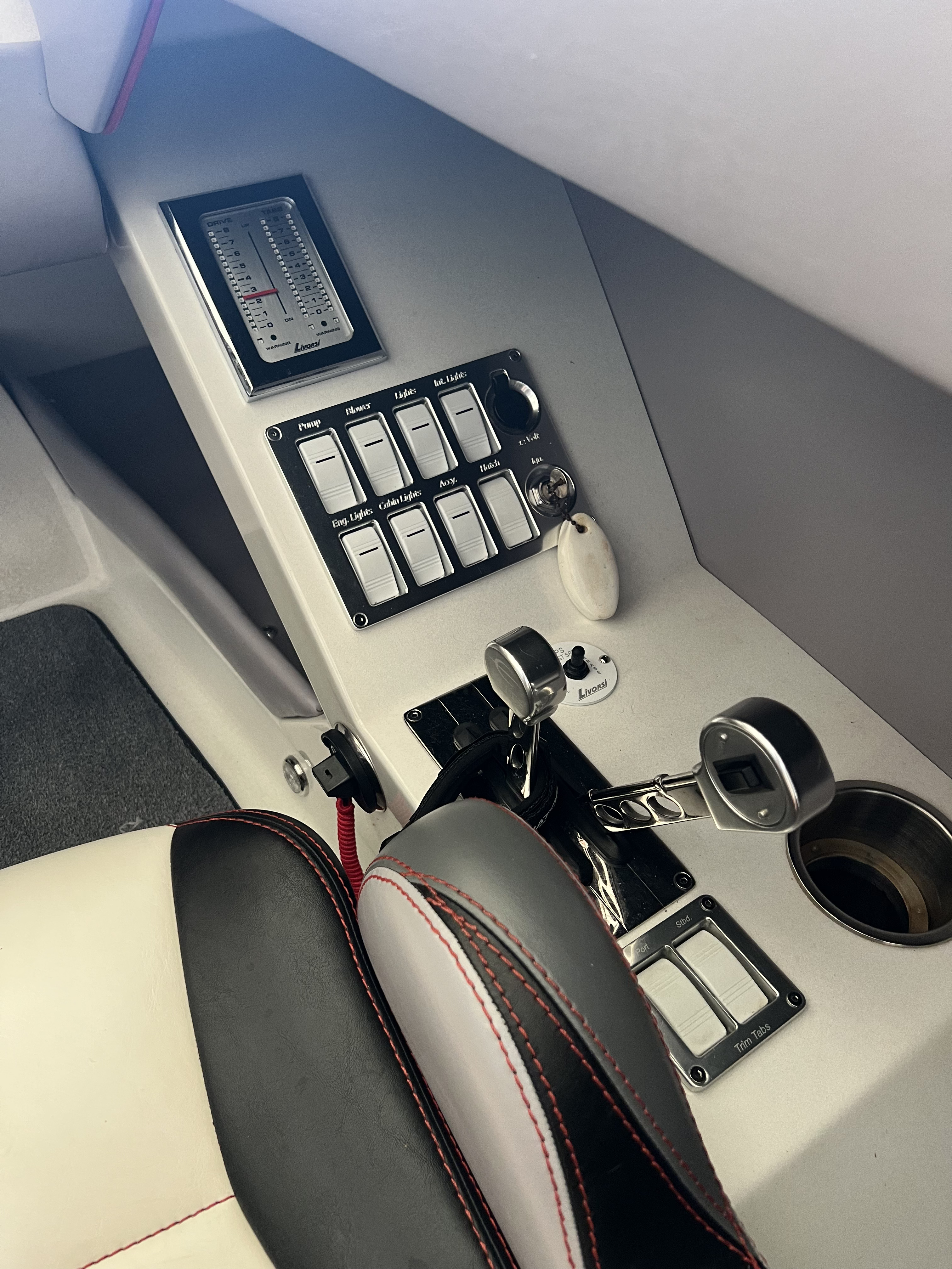 The boat is outfitted with a Mercury Racing 600SCI. When we purchased the boat it had a 4 blade prop and would run about 100 MPH. Since then we have installed a Mercury Racing Labbed 34p 5-blade prop, which slows it to 90+, loaded with fuel and crew, but it takes off and handles perfectly. Lavorsi gauges, 380 k plane tabs, upgraded 10” vessel view with charts. Cockpit cover, full cover, XR ITS Sportsmaster, fusion/kicker stereo, 300 hours on factory sealed engine.